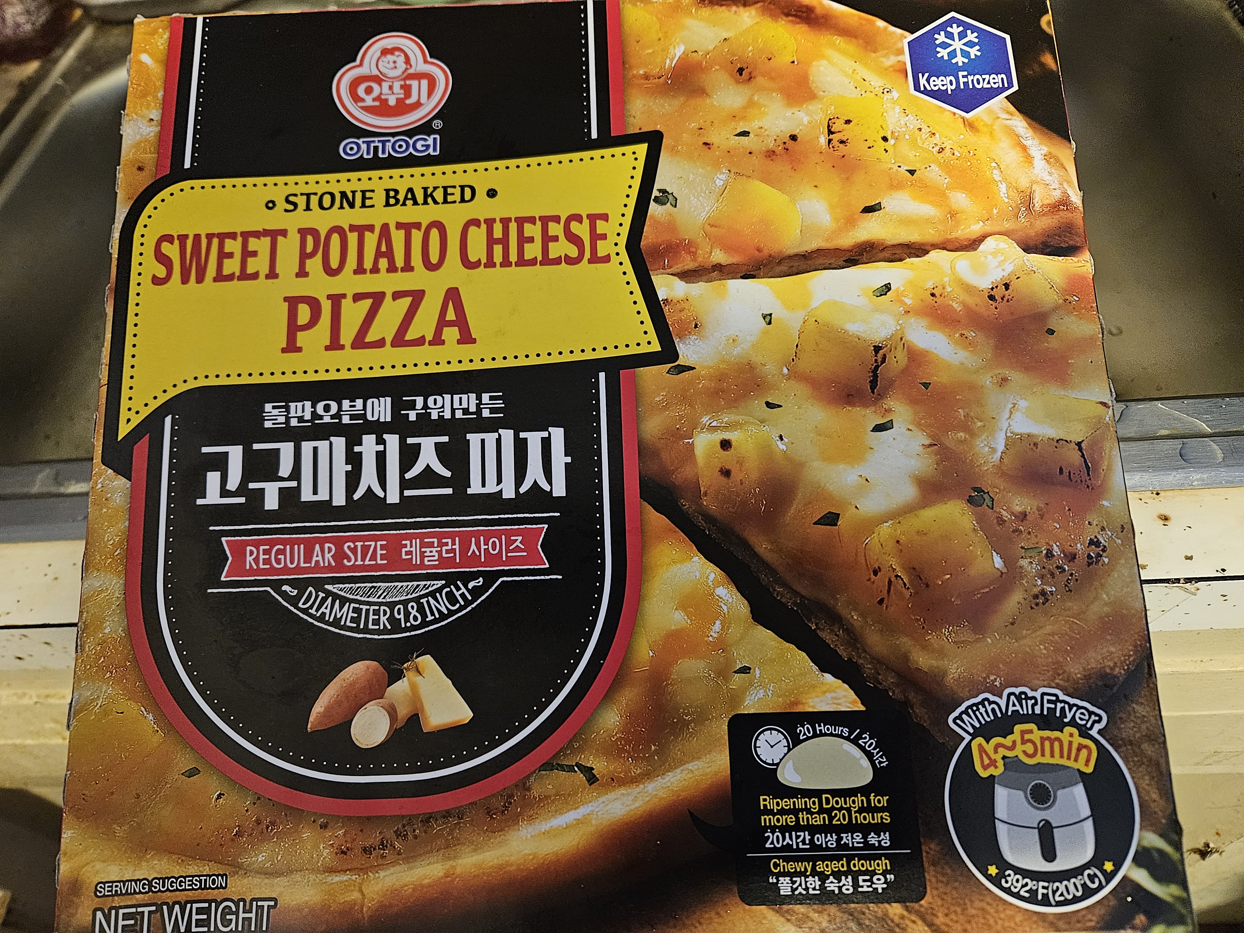 이 피자는 고기가 전혀 안들어가고 고구마랑 체다치즈 랑 모짜렐라 치즈만 들어 있다.