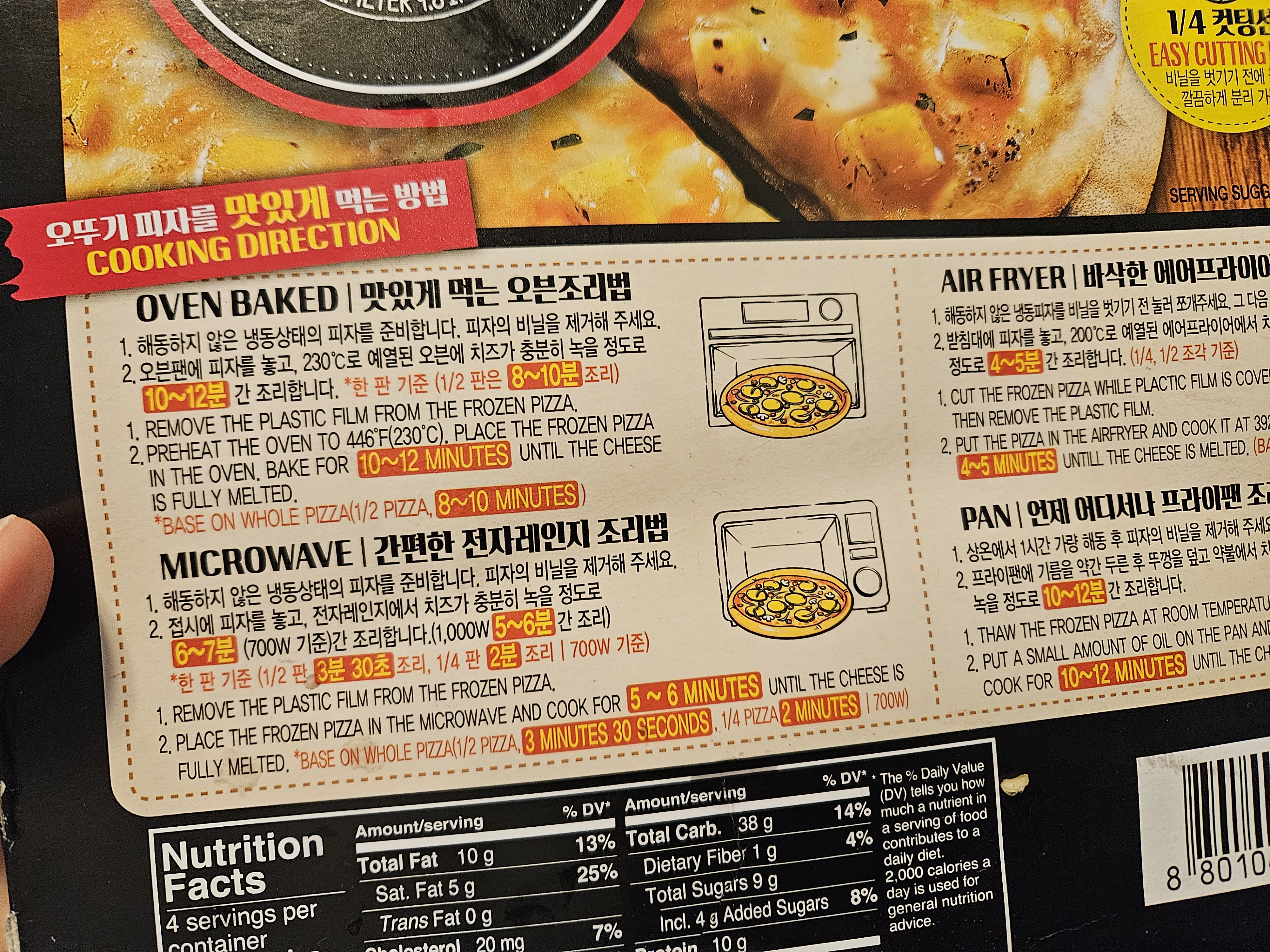 미국수출용이라 그런지 미국 오븐 온도까지 아예 영어랑 한국어가 둘다 표기가 된게 좋았다. 다른 한국에서 수출된 냉동 제품들은 설명서가 스티커 같은걸로 덧대어서 화씨랑 영어로만 설명이 되어 있거든.